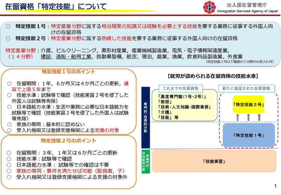 以前の法律では、在留資格は「教授職」や「高度人材」等の取得が困難な場合が多かったのですが、2019年改正後には新たに「特定技能1号・2号」という在留資格が新たに設立されました。